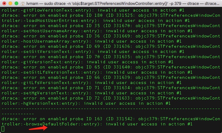 sudo dtrace -n ‘objc$target: STPreferencesWindowController::entry{}’ -p 6840