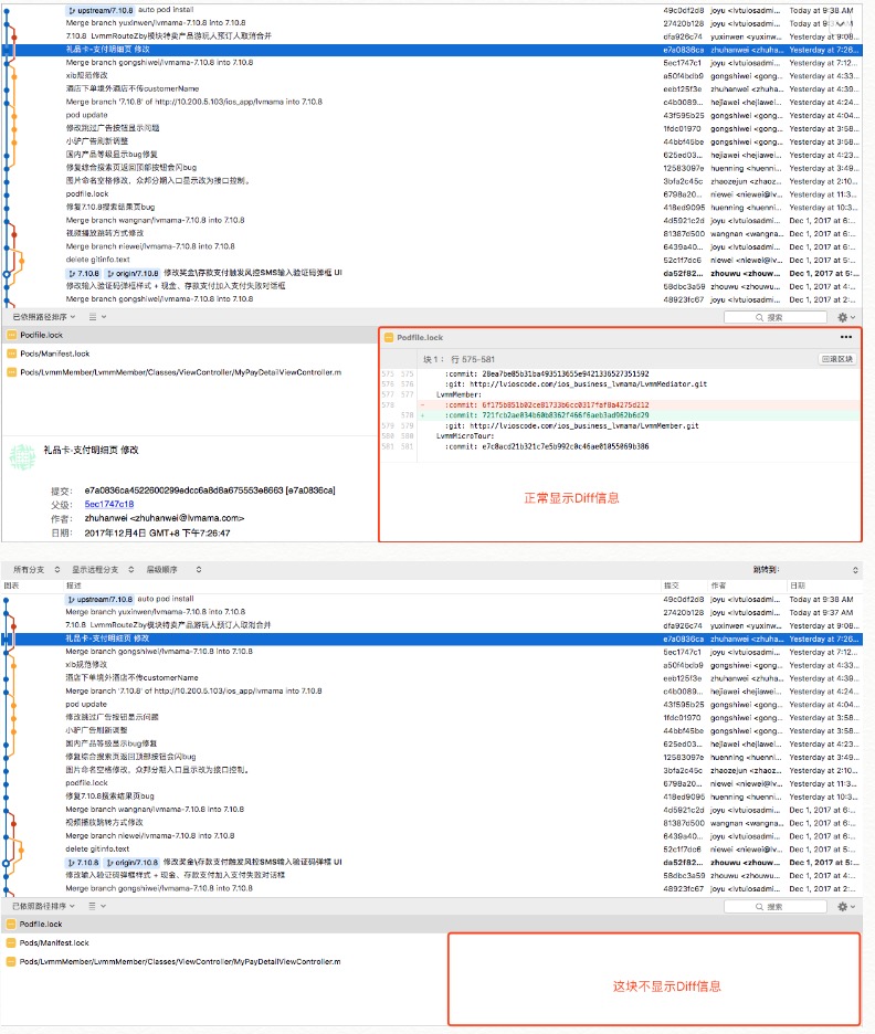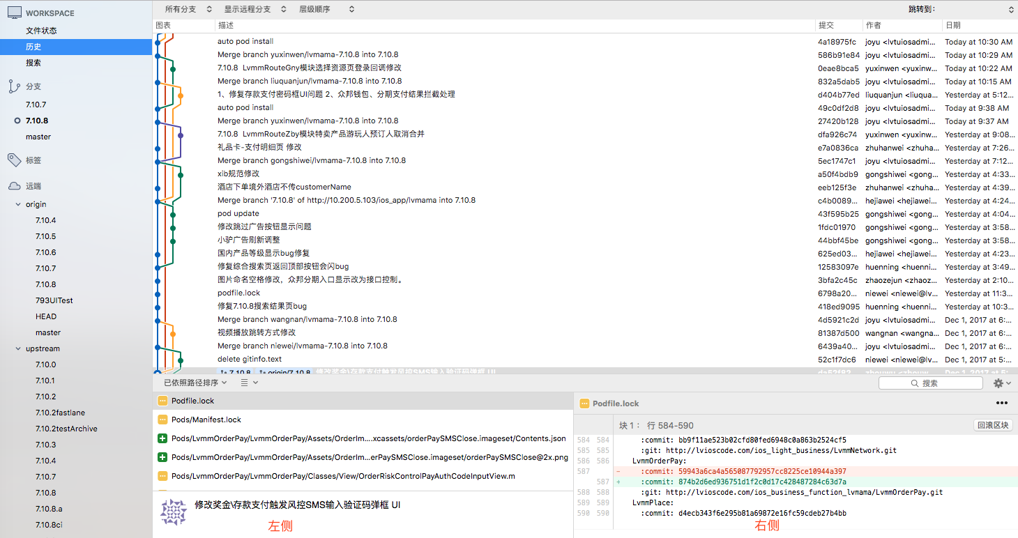 • 根据最后一次选中的历史信息条目显示具体的提交信息(左下角左侧)