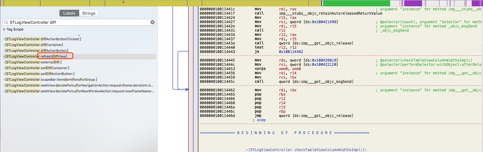 然后通过Hopper反编译STLogViewController 这个类相关的方法,搜索diff关键字,我们发现refreshDiffView这个方法跟我们比对信息执行后的显示很像,我们hook住这个方法就能得到验证。我们现在做的就是把这个方法不要去执行操作,减少内存的消耗,达到不要那么卡的效果。