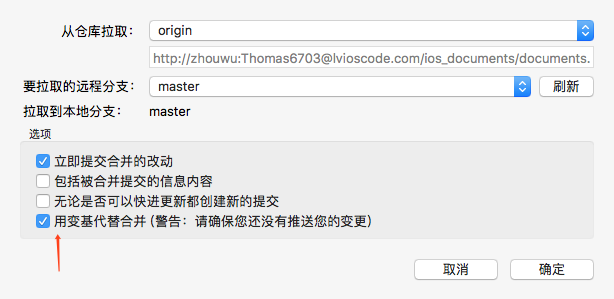 问题2:在点击pull(拉取)按钮时,自动勾选用变基替换合并???
