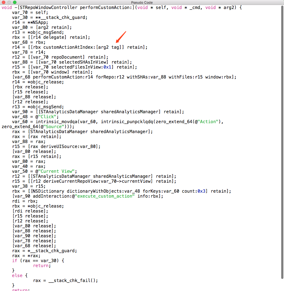 继续搜索这个performCustomAction ,发现STRepoWindowController performCustomAction STRepoWindowController这个class用到了,点击这个方法并分析,看到这个STRepoWindowController class确实用到了SourceTreeAppDelegate performCustomAction:方法,但我们的当前页面class是STGitWindowController